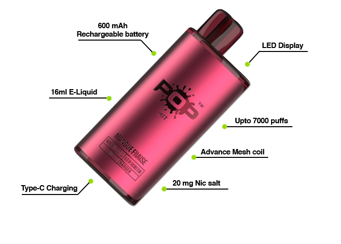 POP Palm our innovative vaping device with 7000 Puff Count, it's filled with 16ml of E-liquid that is perfectly balanced with 20mg nic salt hybrid for a smooth yet satisfying throat hit. Powering this powerhouse is a 600 mAh rechargeable battery ensuring long-lasting performance. Experience the taste and vapor production with its advanced Mesh Coil technology. It also offers a real 50mg Puff Sensation and comes equipped with a Type-C Charging Port and an LED indicator showcasing battery and e-liquid levels